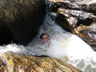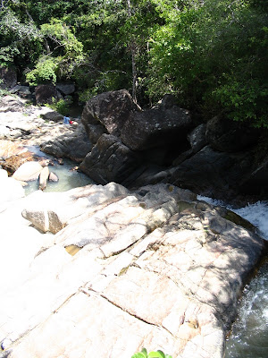 Nach der Kreditkartenaktion und etwas Happi Happi wollten wir aber antuerlich endlich unseren Wasserfall sehen und so zogen wir wieder hinaus mit unserem staehlernen Ross - der Sonne entgegen. (bzw. die komische Bergstrasse entlang) Da die Wasserfaelle zu denen wir dieses Mal wollten (3 an der Zahl) ewig weit weg waren und viel weiter in der Insel, waren auch die Wege laenger und wesentlich beschissener. Immer fein bergauf, bergab, die vom Regen zerwaschenen Sandhuckelwege entlang. Die Wege waeren echt gegangen, haetten die nicht immer so ewig viele tiefe Rinnen vom Regen gehabt. Der Weg schien irgendwie ewig und unsere Hintern hatten auch schon ihren Tribut gezollt, als wir dann endlich am ersten Wasserfall ankamen. Allerdings musste man um zu dem zu kommen erstmal eine Art trockenes Bachbett runterkrackseln. (muss ich sagen dass es warm war?) Dann noch ueber ein paar Steine gehuepft und tadaa, da isser! Nach kurzem Talk mit dem einzigen Menschen dort (ein, eine seltsame Zigarette rauchender :), Brasilianer) war ich dann auch schon ins naechste Wasserloch gehupft. Isa hat sich dann spaeter auch getraut. Sehr erfrischend das Ganze.