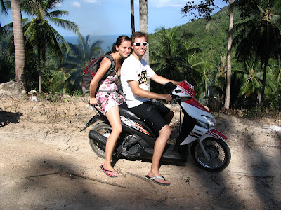 Besonders dolle war unser Trip mit dem Motorbike durch den "Dschungel". Das haben wir uns am 2. Tag bei unserem sehr freundlichen Bungalowtypen fuer 150Baht/Tag (3Eur) ausgeliehen. Unser Plan war damit ins Inselinnere zu fahren und ein paar Wasserfaelle anzuschauen. Mir war zu Anfangs sehr mulmig mit dem Ding, weil du hier jedes Teil was du schrottest (seis auch nur ein Kratzer) komplett neu bezahlen musst - und meine Motorrollererfahrung beschraenkte sich auf 2 Tage Australien 2004. Aber Isa hat mir dann Mut gemacht und so sind wir dann zunaechst im Schneckentempo losgeeiert.