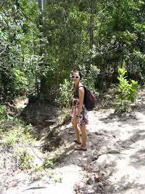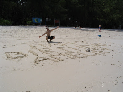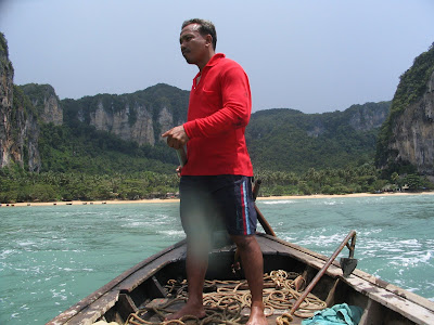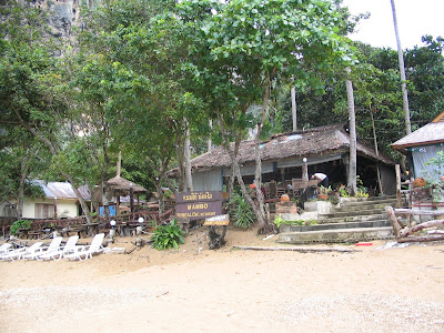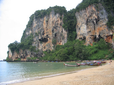 Nach ein bisschen hin und her packen von Sachen und dem installieren der strandueblichen Bademontur an unseren Koerpern sind wir dann den Strand erkunden gegangen. Inklusive dem vorher erwaehnten Railay West und dem dortin fuehrenden "Weg". Der ist eigentlich kein Weg, sonder einfach nur eine Art Pfad durch Felsen und Dschungel mit reichlich Klettereinlagen. Mit Backpack eher lebensgefaehrlich als alles andere. Es sind sogar immer so Seile an die Baeume gemacht dass man die Felsen runter klettern kann. (Das sollte jetzt die Drastik verdeutlichen! :) ) In Railay West angekommen sind wir da dann kurz den Strand langgeschlurpft und haben vor dem lokalen Tauchshop noch ewig hin und her ueberlegt ob wir nicht nochmal Tauchen/Schnorcheln gehen sollten. Allerdings wurden wir die ganze Zeit von einem ziemlich besoffenen Oesterreicher beraten, der dann nicht ganz so vertrauenswuerdig rueber kam, so dass wir das dann gelassen haben.