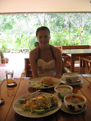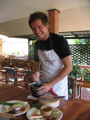 Zuerst haben wir alles ueber die ganzen Zutaten gelernt und dann Stueck fuer Stueck geschnippelt und gekocht und gegessen. Zwischendrin hatten wir uns aus manchmal bisschen schusselig angestellt (besonders ich :) ) und so hab ich zB beim ersten Gericht - Pad Thai - einen von meinen 3 Shrimps aus dem Wok geschnipst. Auch beim zubereiten der Currypaste haben uns die netten Damen erstmal zeigen muessen wie man Moerser und Stoessel richtig bedient. Aber Zuhause gibts ja den Mixer fuer sowas.