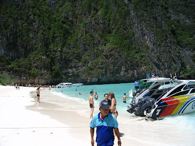 Los gings das ganze um 8:00, so dass wir um 7:00 aufstehen mussten. Hierbei hat auch die kalte (es gibt keine warme) Dusche nicht sehr viel von der Muedigkeit eliminiert. Nach kurzer Fahrt mit dem Minivan und 20min warten am Company eigenen Pier sind wir auch schon ins Speedboot geklettert. Die Gruppe bestand mehr aus richtigen Touristen, als Backpackern - 6 davon auch zwischen 35 und 55. War halt dementsprechend eher ruhige Atmosphaere. Mit dem Boot sind wir dann 60min Richtung Phi Phi Lay, einer unbewohnten Insel, gefahren. Hier konnte man bisschen Fotos machen, Schnorcheln gehen und dann noch den Drehort von "The Beach" bestaunen. Letzteres allerdings nebst hunderten anderen Touristen. Kann man mal gemacht haben, aber ist jetzt nicht wirkllich doll und wie gesagt, sogar in der Nebensaison sehr ueberlaufen. In der Hauptsaison kann man wohl mit dem Boot nichtmal an den Strand fahren sondern muss vom Meer aus da hin schwimmen.