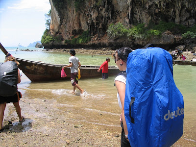 Als wir dann in Ao Nang, dem Ort von dem dann das Boot faehrt, angekommen sind wurde uns auch gleich von einem der Boottypen zugerufen, dass wir gleich fahren koennen. Der ganze Spass funktioniert naemlich immer so, dass ein Boot ca. 700 Baht kostet und die Summe immer durch die Zahl der Leute geteilt wird. Und daher warten immer alle auf mehr Leute. Wir waren dann gluecklicherweise zu acht, so dass es fuer jeden dann 100Baht waren. (Thai Rechnung halt :) ) So sind wir dann allesamt mit Sack und Pack in diese Nussschale geklettert und losgefahren. Die Fahrt war ganz ok, da das Boot wenigstens ein Dach hatte. Allenfalls die Wellen merkt man doch recht deutlich, so dass die Seasick Tabletten wieder mal ihren Wert beweisen konnten. :)