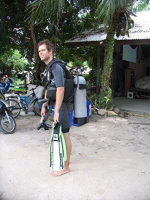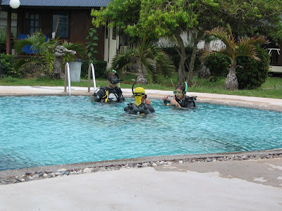 Aalso.. ich war ja die letzten Tage etwas faul, aber Isa hat euch ja schon ein bisschen ueber meinen Tauchkurs informiert. Allgemein mache ich hier meinen Open Water Diver (PADI Certificate OWD) bei einer Tauchschule. Mit dem kann ich dann mein Leben lang bis zu 18m Tiefe tauchen. Kosten tut mich das Ganze hier ca 180Eur, was im Gegensatz zu D sehr guenstig ist. Einer sagte sogar dass Koh Tao neben Honduras der zweitbilligste Platz auf der Erde ist wo man das machen kann. Also immer her damit.