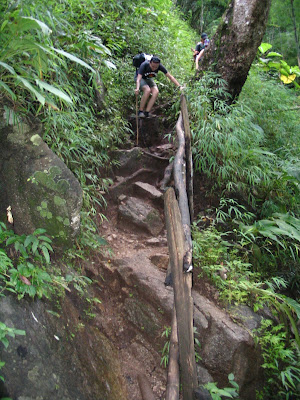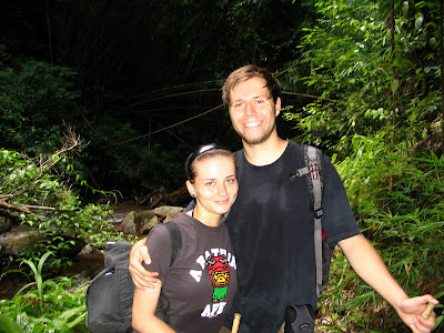 Da wir OBEN auf dem Berg waren, mussten wir heute ja Gott sei Dank nur runter laufen. Das sollte ja machbar sein. Obwohl wir auf Grund des starken Regens in der Nacht (oops, vergessen zu schreiben :) ) schon bisschen vorsichtig waren. Berechtigter Weise. Denn nach dem ersten paar Schritten hat sich gezeigt, dass der Weg ziemlich steil und ziemlich matschig war. Dementsprechend hats auch immer wieder Leute hingeklatscht. Ich war einer davon und sah dann erstmal aus als haette ich mir ins Hoesle gemacht. Zwar war das Ganze wieder entsprechend anstrengend, aber nich halb so schlimm wie das den Tag zuvor. Zwischendurch gabs auch wieder den obligatorischen Wasserfall zum Schwimmen und Duschen.