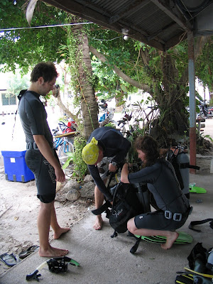 Schliesslich hatten wir heute unsere ersten 2 Tauchgaenge im Meer. Also um 6:15 aus den Federn und ab zum anderen Resort wo das immer alles los geht. Noch fein Fruehstueck gegessen mit Ayala (etwas ekliges Ruehrei und Toast) und ab dafuer. Auf dem Boot - eine Art kleinerer Kutter, waren alle die heute irgendeinen Tauchgang machen mussten. Ca 25 Mann oder so. An beiden Seiten des offenen Unterdecks waren Baenke nach innen mit den Tanks dahinter, dass man die leichter "aufsetzen" kann. Am Anfang mussten wir unsere Sachen zusammenbauen wie sie gehoeren. Dabei ist mir schon nicht mehr all zu wohl gewesen und das eklige Ruehrei machte sich bemerkbar. Noch zwei schwankende Schritte nach rechts und links und schwupp hing ich auch schon mit dem Kopf aus dem Boot und habe eher unfreiwillig die Fische gefuettert. Sehr feine Sache ich sage euch.