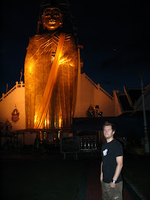 Nachdem wir also irgendwo in der Naehe von Chinatown an einer Ecke standen, hat uns wiedermal ein netter Thai angequatscht und gefragt wo wir denn hin wollen. Er meinte dann wir muessen dringend noch heute den Lucky Temple und den Stehenden Riesenbuddha ansehen, da nur heute das ganze keinen Eintritt kostet. Ebenso sollten wir noch zu einem ThaiFashion Laden, da dort wirklich nichts mit Kommission laeuft. Er war dann noch so nett uns einen Tuk Tuk driver zu organisieren, der uns die ganze Strecke fuer 60 Baht fahren sollte und auch vor den jeweiligen Tempeln auf uns warten sollte. Gesagt getan.