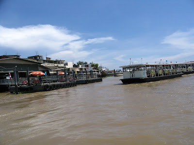 Heute wollten wir mal ein anderes Verkehrsmittel ausprobieren und sind mit verschieden Faehren ueber den Fluss in Bangkok gefahren. Eine Fahrt kostet 3,50 Baht (das duerften 7 Cent oder so sein).
