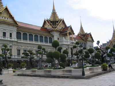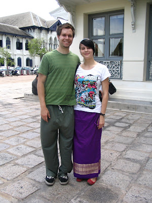 Als erstes hatten wir uns den Grand Palace, also den Palast des Koenigs vorgenommen. Da wir beide nicht dem Anlass entsprechend gekleidet waren, gab es eine lange Stoffhose fuer Kevin und einen Sarong fuer mich. Und das ganze, man mag es kaum glauben, fuer umsonst. Wir mussten nur einen Pfand hinterlegen und haben das am Ende wieder bekommen. Natuerlich war es in der langen Hose und dem langen Sarong noch einmal deutlich waermer, als es so schon war. In dem Areal des Palasts befindet sich auch ein Tempel, genannt Wat Phra Kaew. Das Highlight duerfte ein Smaragdbuddha sein. Die Bilder sprechen hoffentlich fuer sich.