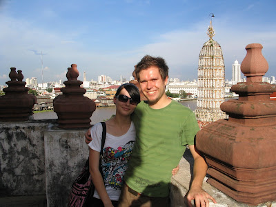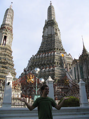 Und der dritte und letzte Tempel fuer den heutigen Tag war Wat Arun, der komplett mit Porzellan dekoriert wurde, da frueher die Chinesen auf ihren Booten so viel Porzellan mitgebracht hatten. Auf diesen Tempel konnten wir sogar aussen bis ganz noch oben "klettern". Das war eine ziemliche anstrengende Angelegenheit, da wie gesagt heute die Sonne schien und die Stufen ewig steil waren.