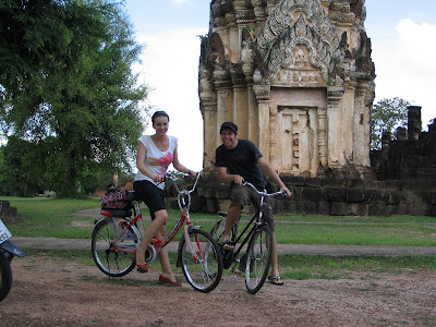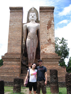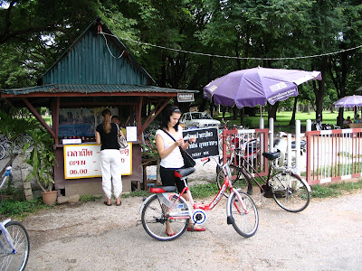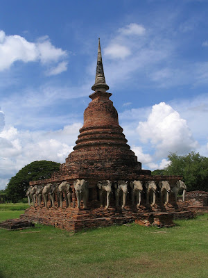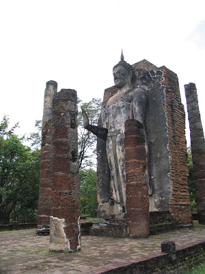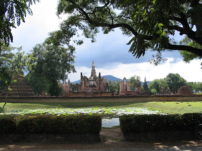 An dem Historical Park angekommen haben wir uns jeder ein Fahrrad ausgeliehen, da wir dank Lonely Planet wussten, dass der Park sehr gross sein soll. Die Leihgebuehr betrug auch nur 30 Baht/Fahrrad. Der Park besteht aus mehreren Zonen - einer inneren Zonen und vier aeusseren Zonen. Erst haben wir einen Teil der inneren Zone abgefahren und uns den wahrscheinlich besterhaltenen Tempel "Wat Mahathat" angeschaut. Und sind dann Richtung Nordwesten zu den auesseren Teilen gefahren. Dort waren wir so ziemlich die einzigen Touristen, die in der absoluten Mittagshitze mit dem Fahrrad irgendwelche kleinen Strassen entlang gefahren sind. Aber wir beide fanden das ziemlich entspannt, zumal die Landschaft ringsrum einiges zu bieten hatte.